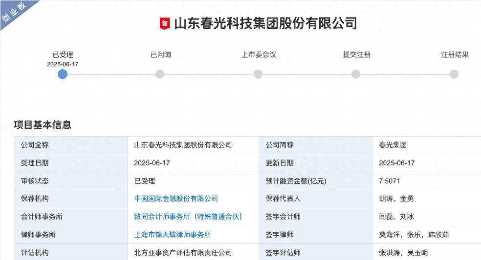深交所官网显示,6月17日,山东春光科技集团股份有限公司(简称:春光集团)IPO申请获受理,保荐机构为中国国际金融股份有限公司。这是2025年深交所受理的第7家IPO、第4家创业板IPO。