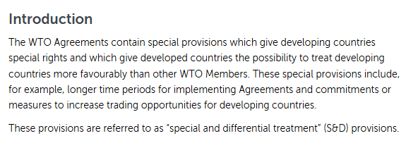 在世贸组织框架下,发展中成员的特殊和差别待遇通常是给予发展中成员和最不发达成员在开放程度、义务履行及过渡期等方面的优惠安排。